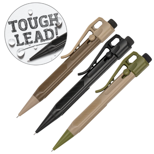 - Tough-plastic pocket clip, lanyard loop to tie pencil down or hook to gear, triangular textured grip, click lead advancement